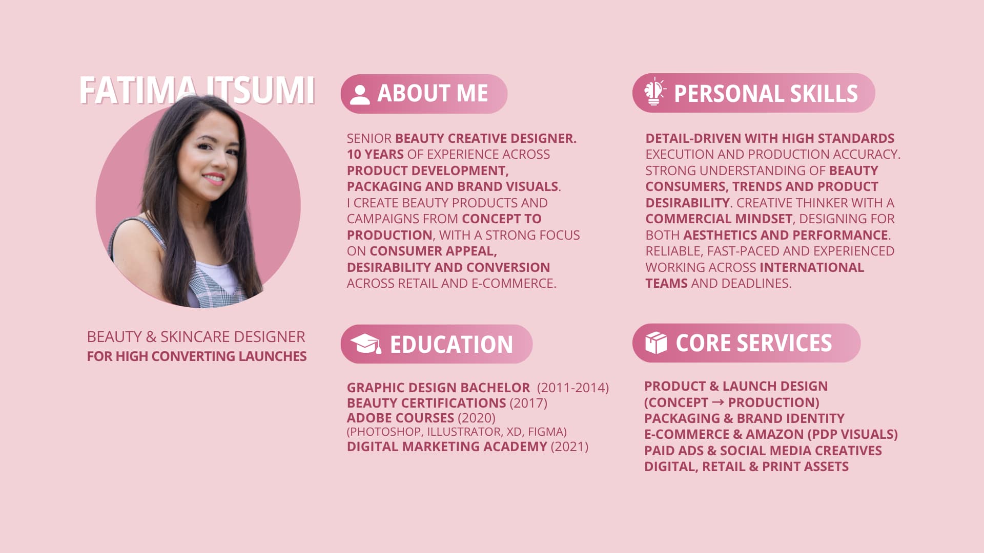 Fatima has an exceptional eye for beauty design. She transforms ideas into visually compelling products that resonate emotionally with consumers and strengthen brand identity.