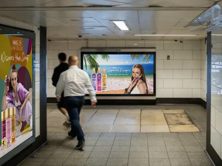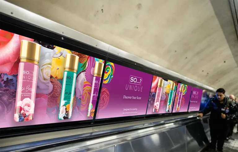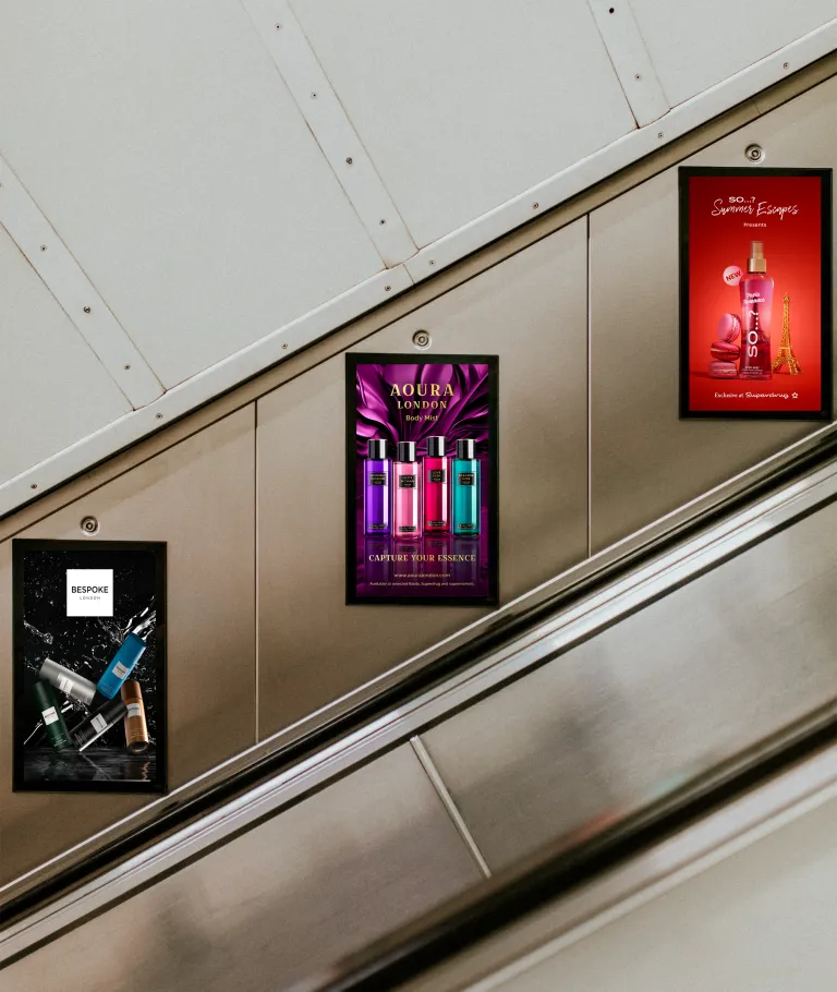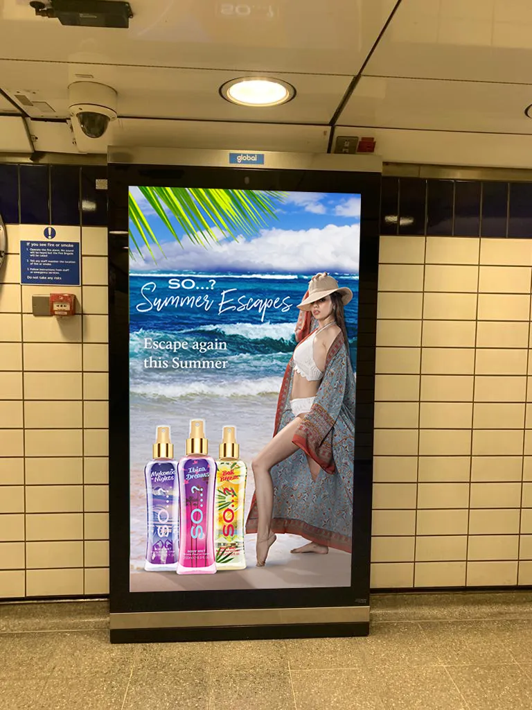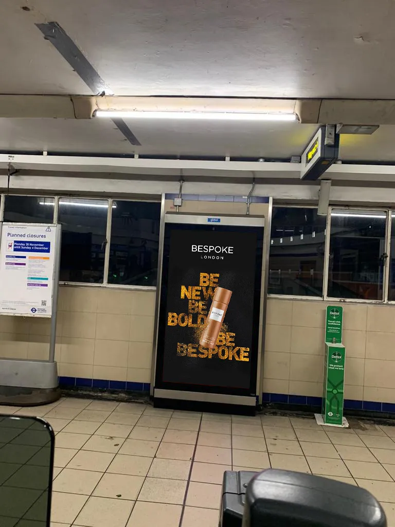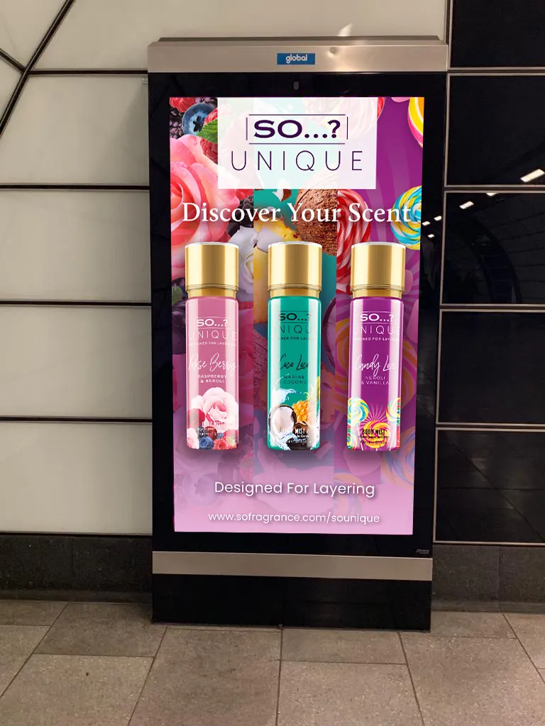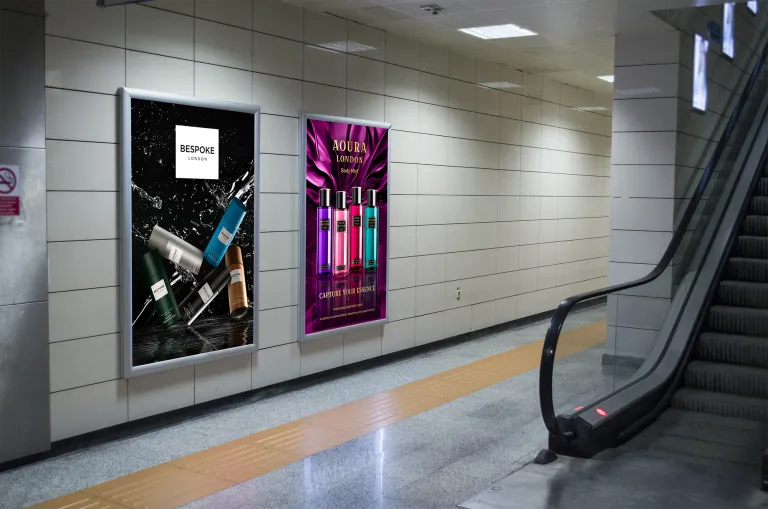Successful cosmetic brand advertising for physical spaces requires a deep understanding of “glance-ability.” Unlike a website where a user might linger, an underground advertisement must communicate the brand’s core message in less than three seconds. The Aura Body Mist campaign utilizes a minimalist yet bold approach to cosmetic brand advertising. By stripping away clutter and focusing on a hero image of the product accompanied by punchy, aspirational copy, the design captures the essence of the brand instantly.