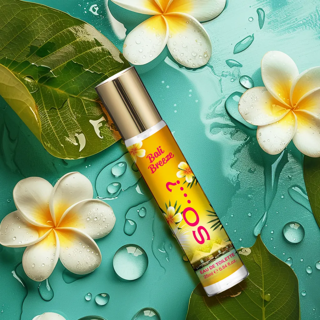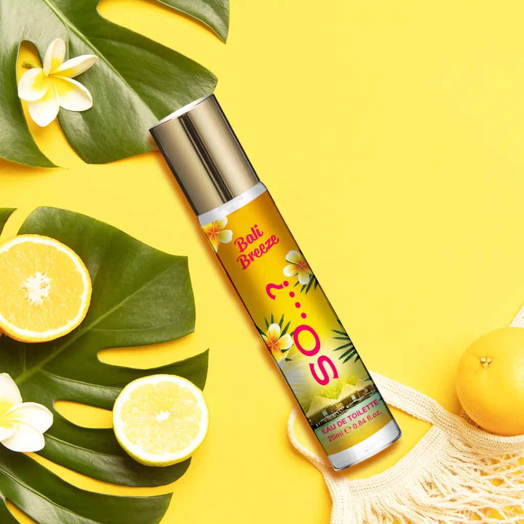 Effective travel size perfume packaging design serves as a sensory bridge. Since the “Escape” range is built around scents like “Bali Breeze” or “Ibiza Dreams,” the visuals must mirror those olfactory notes. The creative process involved selecting a color palette that feels sun-drenched and vibrant. By using high-saturation gradients, the travel size perfume packaging design creates a sense of depth and movement, mimicking the shimmering of the ocean or the heat of a summer sky.